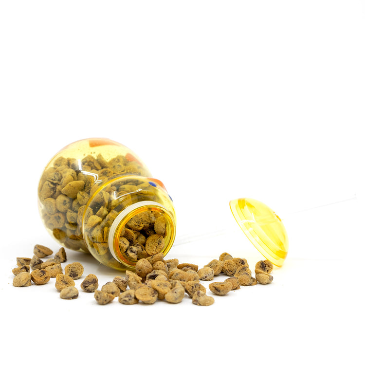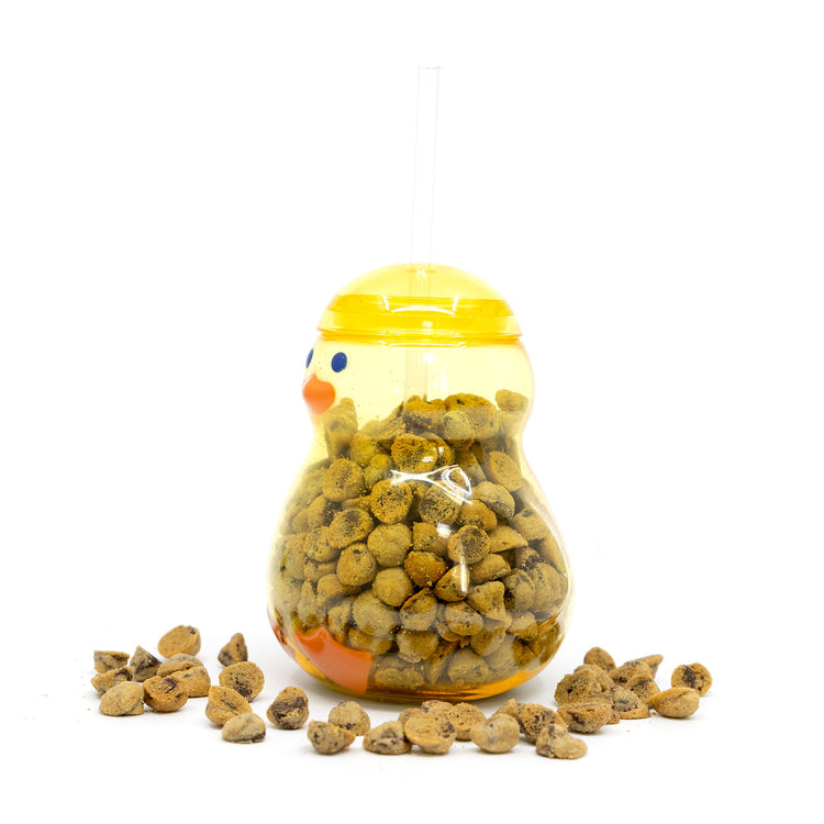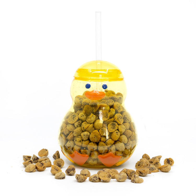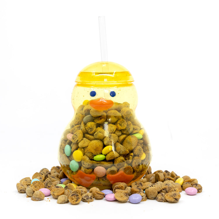 Our Chirpy Chick Tumbler brings springtime joy with its adorable design and delectable treats inside. This charming clear tumbler features a bright yellow cap, playful blue eyes, cheerful orange beak, and cute orange feet – creating the perfect chick-shaped vessel for our famous Microchip Cookies.