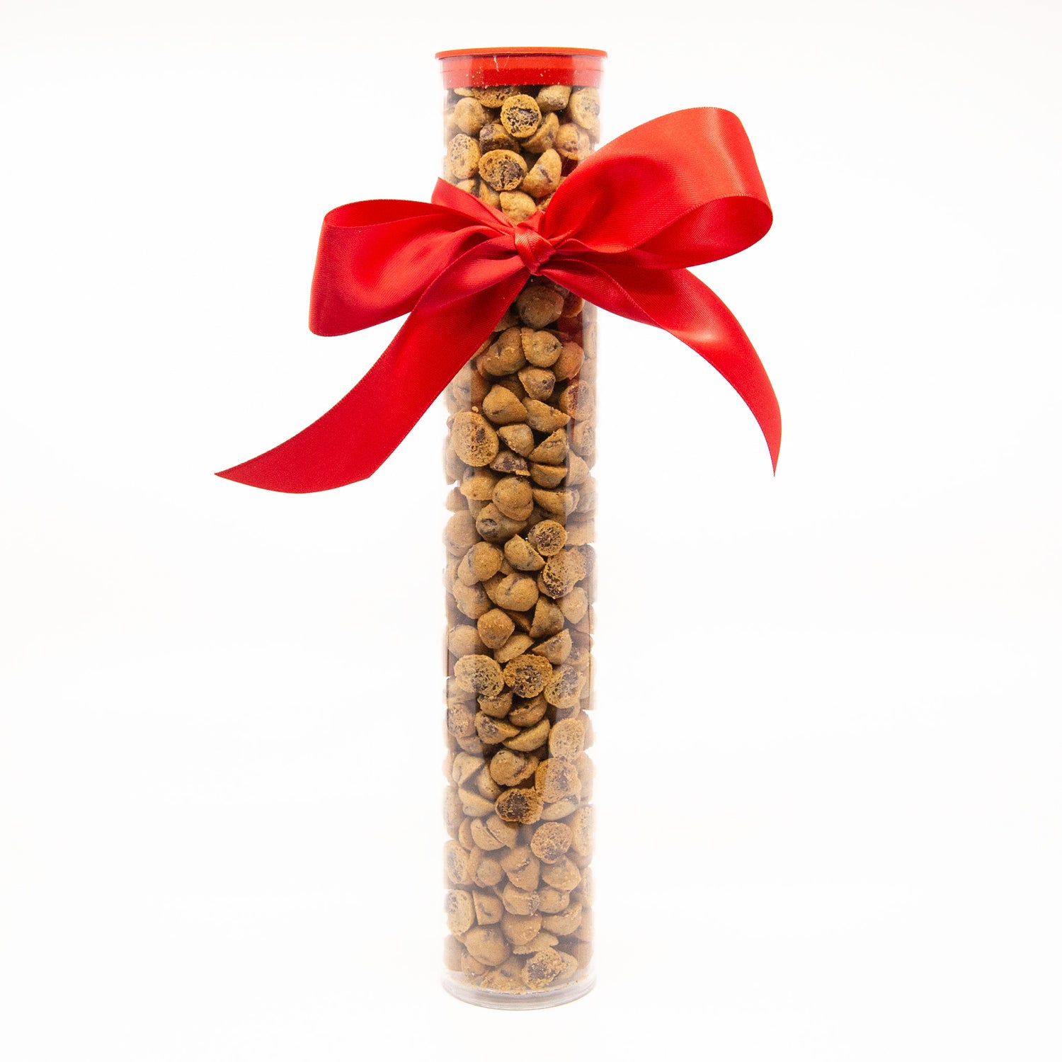 Over 11 ounces of your favorite Microchips elegantly displayed in a clear acrylic tube topped with a vibrant red cap and finished with your choice of hand-tied satin bow. This substantial baton creates a stunning vertical showcase for our impossibly tiny cookies, transforming them into an eye-catching gift that's as impressive as it is delicious.