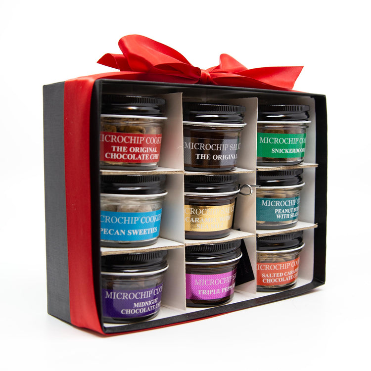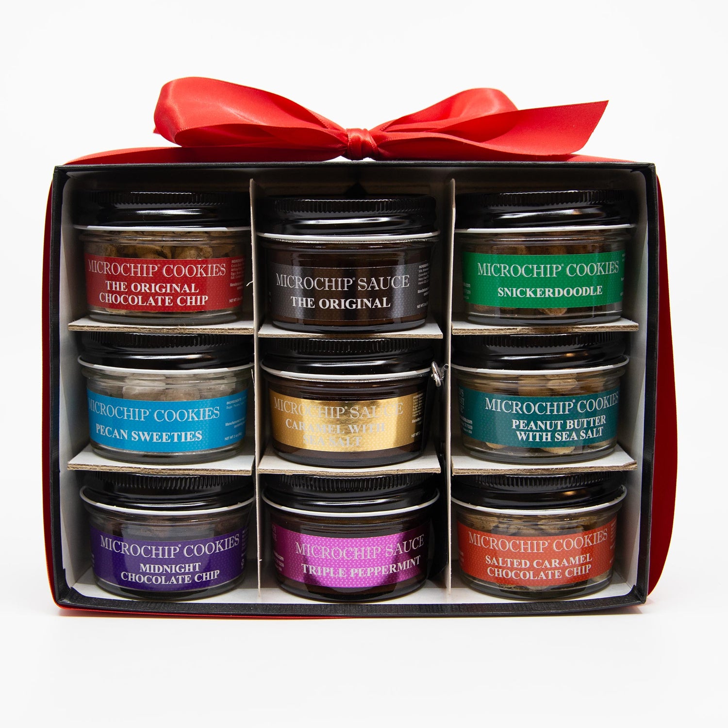 The ultimate sweet symphony in tiny form. Our Super Sweet Stack orchestrates nine of our most beloved treats—six magnificent cookie varieties from Original Chocolate Chip to sophisticated Midnight Chocolate Chip, plus three irresistible sauce companions that transform tiny cookies into extraordinary experiences. From the buttery perfection of Pecan Sweeties and warm spice of Snickerdoodle to the indulgent richness of our signature sauces, this collection proves that when it comes to sweetness, more is definitely more. Topped with a hand-tied satin bow, it's the gift that turns dessert into an event. The varieties include: The Original Chocolate Chip, Pecan Sweeties, Snickerdoodle, Chocolate Peanut Butter Cup, Midnight Chocolate Chip, Salted Caramel Chocolate Chip, The Original Sauce, Caramel with Sea Salt Sauce, and Triple Peppermint Sauce.