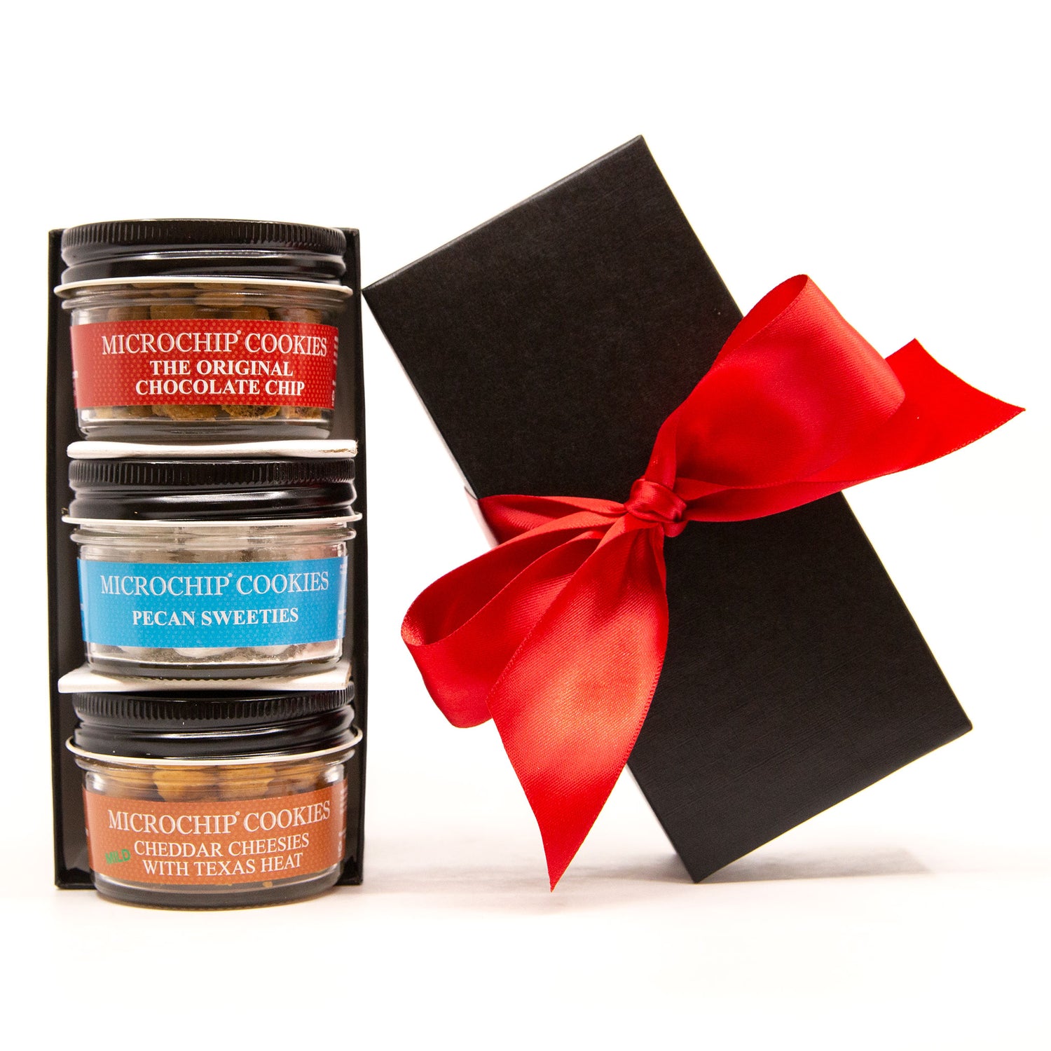 Three of our most beloved Microchip Cookie varieties united in one elegant gift box, finished with a hand-tied satin bow. This trio features The Original Chocolate Chip, Cheddar Cheesies with Texas Heat, and Pecan Sweeties—a perfect balance of sweet and savory in impossibly tiny packages.