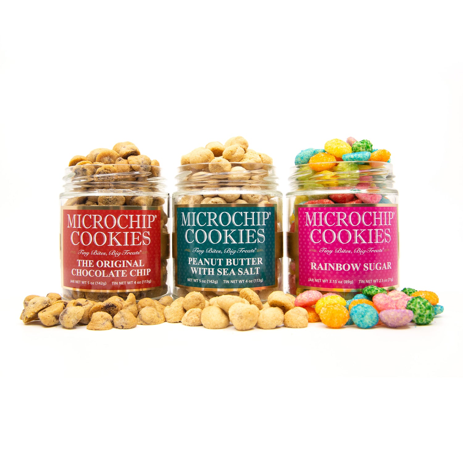 Each jar reveals our miniature masterpieces through crystal-clear glass—cookies measuring barely half an inch across yet delivering full-sized flavor experiences that defy logic and create instant wonder. Select from 16+ varieties of our signature cookies (or sauces), crafting a trio of flavors that tells a complete tasting story.