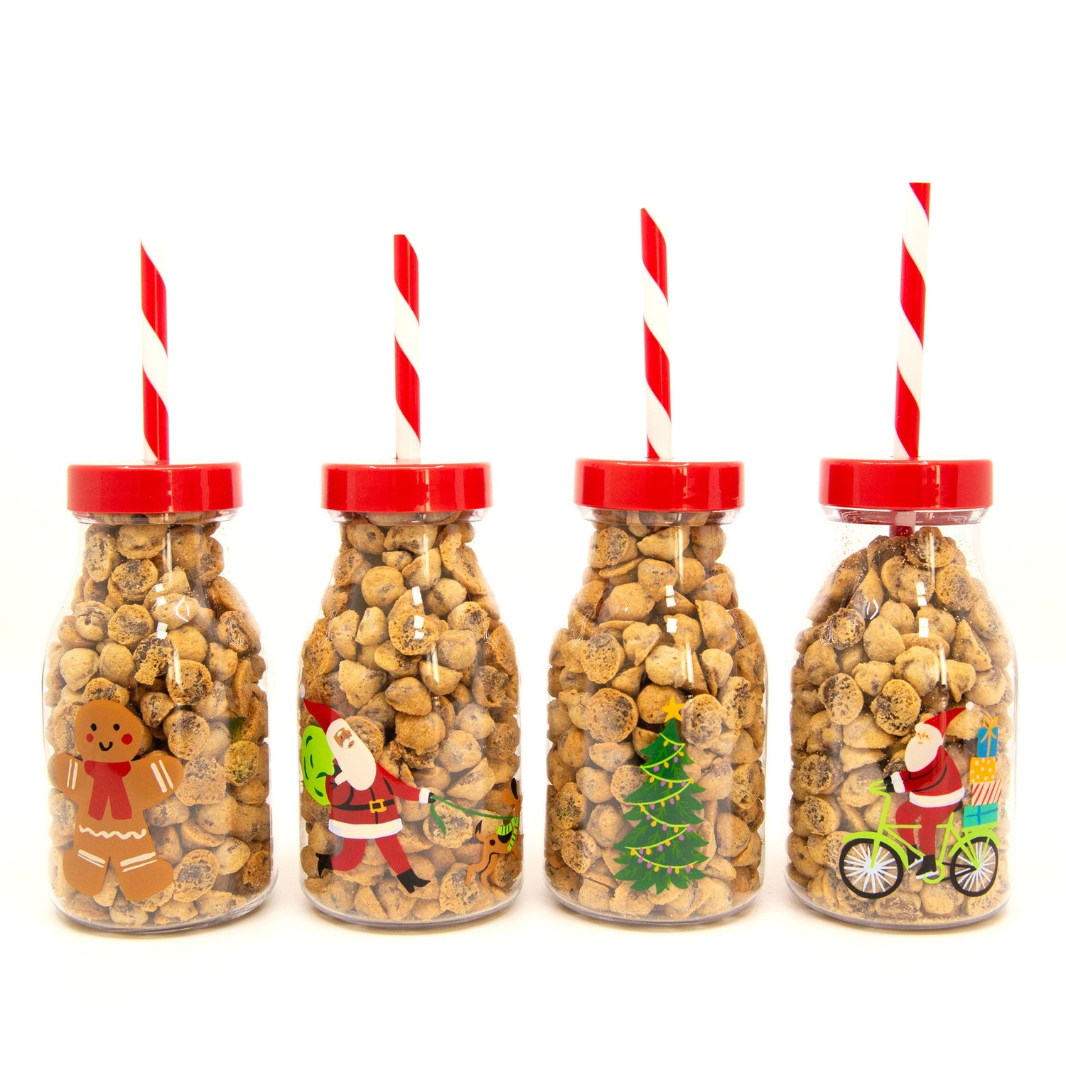 Enjoy a whimsical taste of holiday cheer with our nostalgic Gingerbread Man Milk Bottle! Crafted from crystal-clear, BPA-free acrylic, this retro-inspired bottle is topped with a festive candy cane-striped straw and features a jolly gingerbread man. The charming bottle comes filled with our signature small-batch Microchip Cookies, made with premium ingredients in our Dallas bakery. These delightful containers make perfect stocking stuffers, party favors, or whimsical additions to any holiday table setting - and once the cookies are gone, they're perfect for serving actual milk or other beverages.