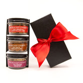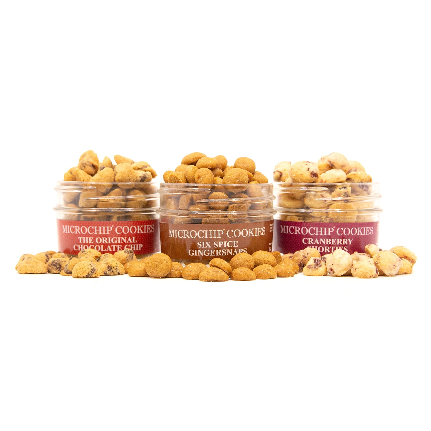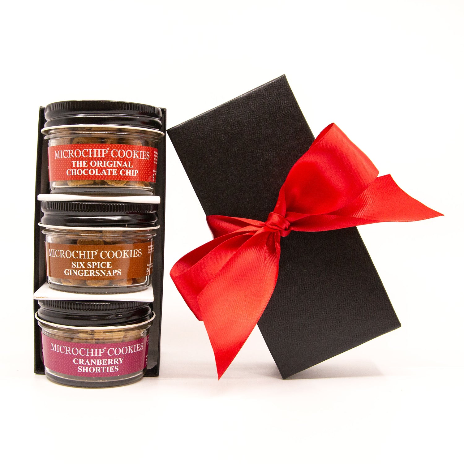 Only the freshest and highest quality ingredients go into JK Chocolate Microchip Cookies, which are all made from scratch in small batches. Our elegant stay-fresh glass jar seals in the freshness of our treats, and makes for a versatile decorative container after the contents are finished. Perfect under the Christmas tree or in a stocking. The Holiday Stack Party Favor Jar Trio features three of the most popular chocolate Microchip Cookie varieties together in one box with a hand-tied satin bow: The Original Chocolate Chip, Six-Spice Gingersnap, and Cranberry Shorties.