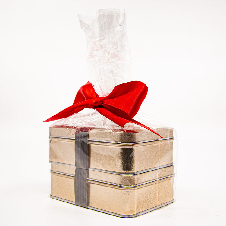 Two signature tins, each holding approximately 4 ounces of our miniature marvels, paired with purpose and finished with hand-tied satin ribbon—creating a gift that's both generous and gracefully proportioned.