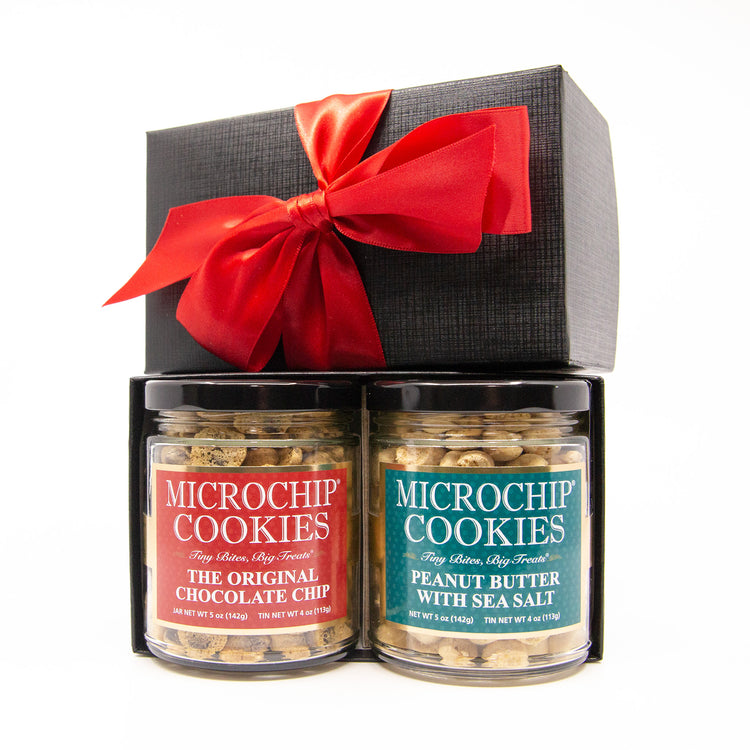 Two crystal-clear jars. One perfect pair. Our most popular gift jar comes in a set of two—choose any two of our Microchip varieties to create the perfect flavor pairing in elegant stay-fresh glass jars. Whether you're matching personalities (Original Chocolate Chip for the classic soul, Midnight Chocolate Chip for the sophisticated spirit) or creating delicious contrasts, this duo delivers double the joy in our signature premium presentation. Because sometimes one jar of tiny perfection calls for backup.